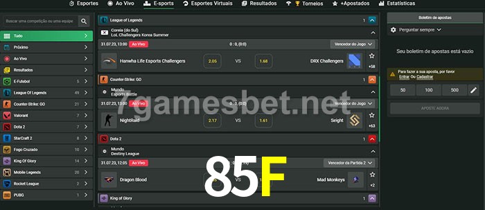 O 85F oferece uma grande seleção de opções de apostas em e-sports com probabilidades competitivas